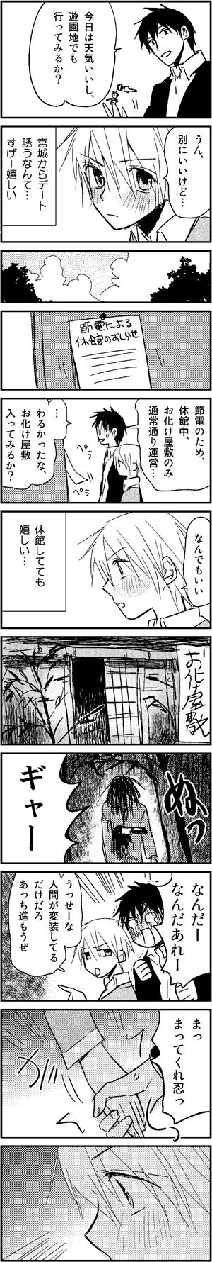 お化け屋敷で叫んで、夜は忍チンのマグナムに喘いで、翌日声ガラガラになってヒロさんにツッコまれるんですね(not下半身…いや、別に下半身突っ込まれる宮城でも全然…むしろいいです(≧ω≦)b )