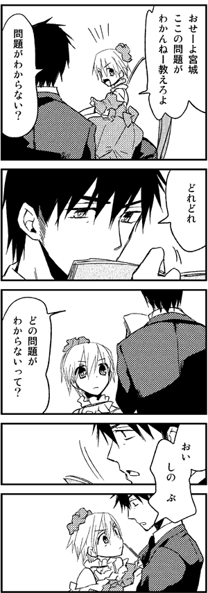 >「何にでも影響される忍チンちょう可愛いよねっ><*しかも頭のっけろ!って強制的なとこが可愛くて萌える・・・!!宮城悔しいけどカッコイイ・・・(・∀・)宮城め・・・膝枕うらやましい・・・。 」