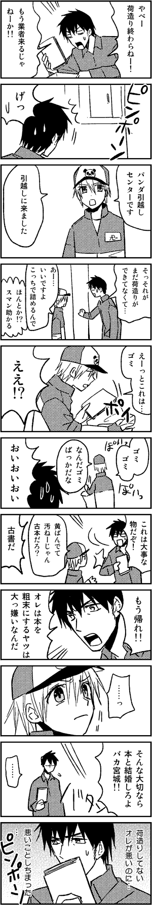 >私も宮城で暖をとりたい…ハァハァ 3コマ目の忍。釣り上った眉に大きなたれ目。生意気そうな感じが原作の雰囲気よくでていると思います 引っ越しがんばってください。 荷造りの手抜き技をひとつ~~