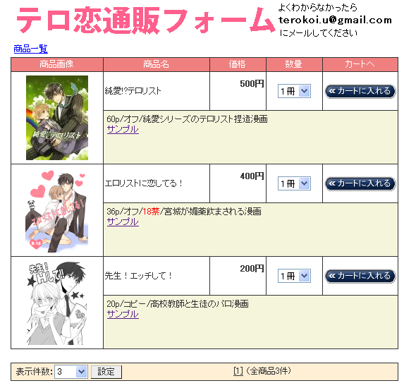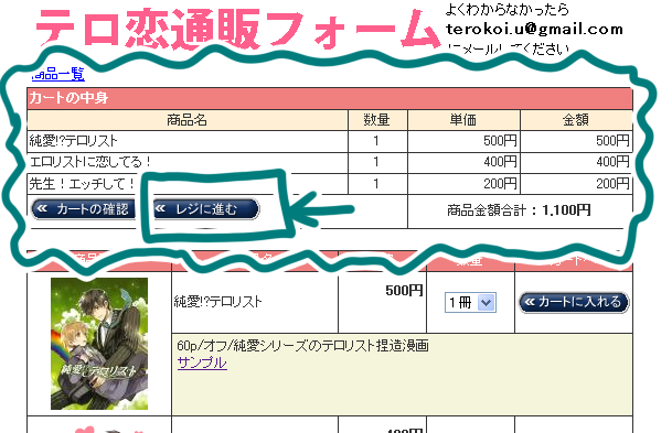 上に選んだ同人誌が表示されます。選び終わったら、「レジに進む」を押すと↓